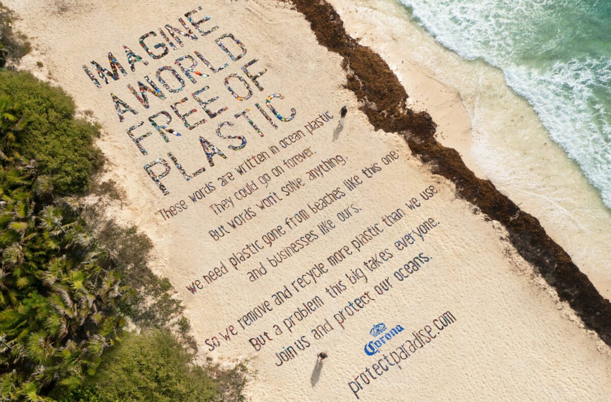 As part of Corona’s commitment to net-zero plastic, the brand led a conservation-style activation on a Yucatán beach last month with a short message written into the sand, in which the 77 letters used were written using discarded plastic collected from the beach, illustrating the true scale of the plastic pollution issue.