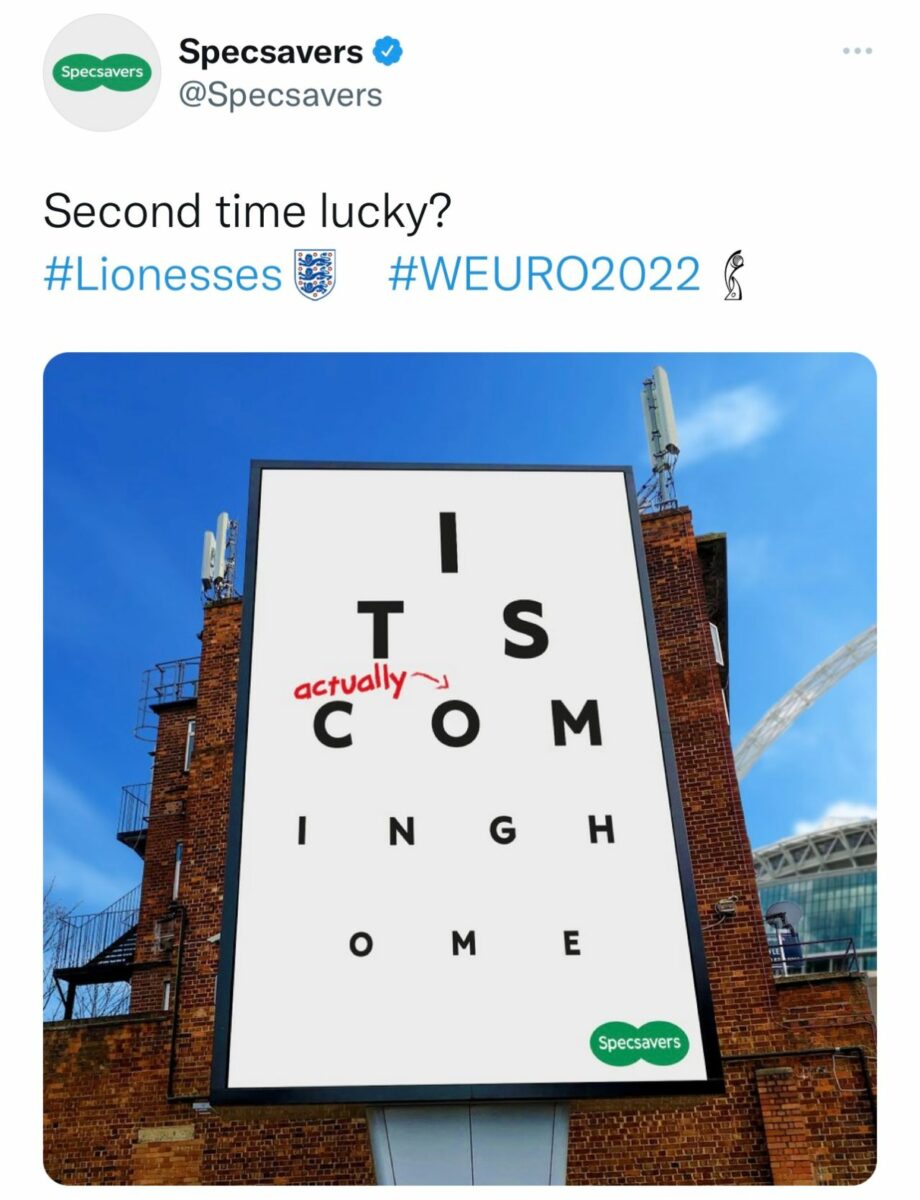 Optician chain Specsavers has also opted for a “Football’s Coming Home” reference for its activity, with a twist on the traditional eye test featuring the words “It’s (actually) Coming Home”.