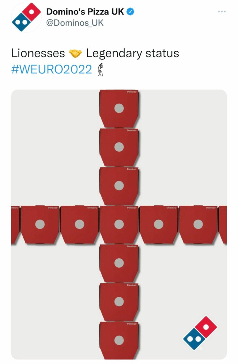Perhaps a little less original, but nonetheless quickly turned around – global pizza chain Domino’s has opted for a classic St. George’s cross-themed social post with the caption reading “Lionesses ???? Legendary status”.