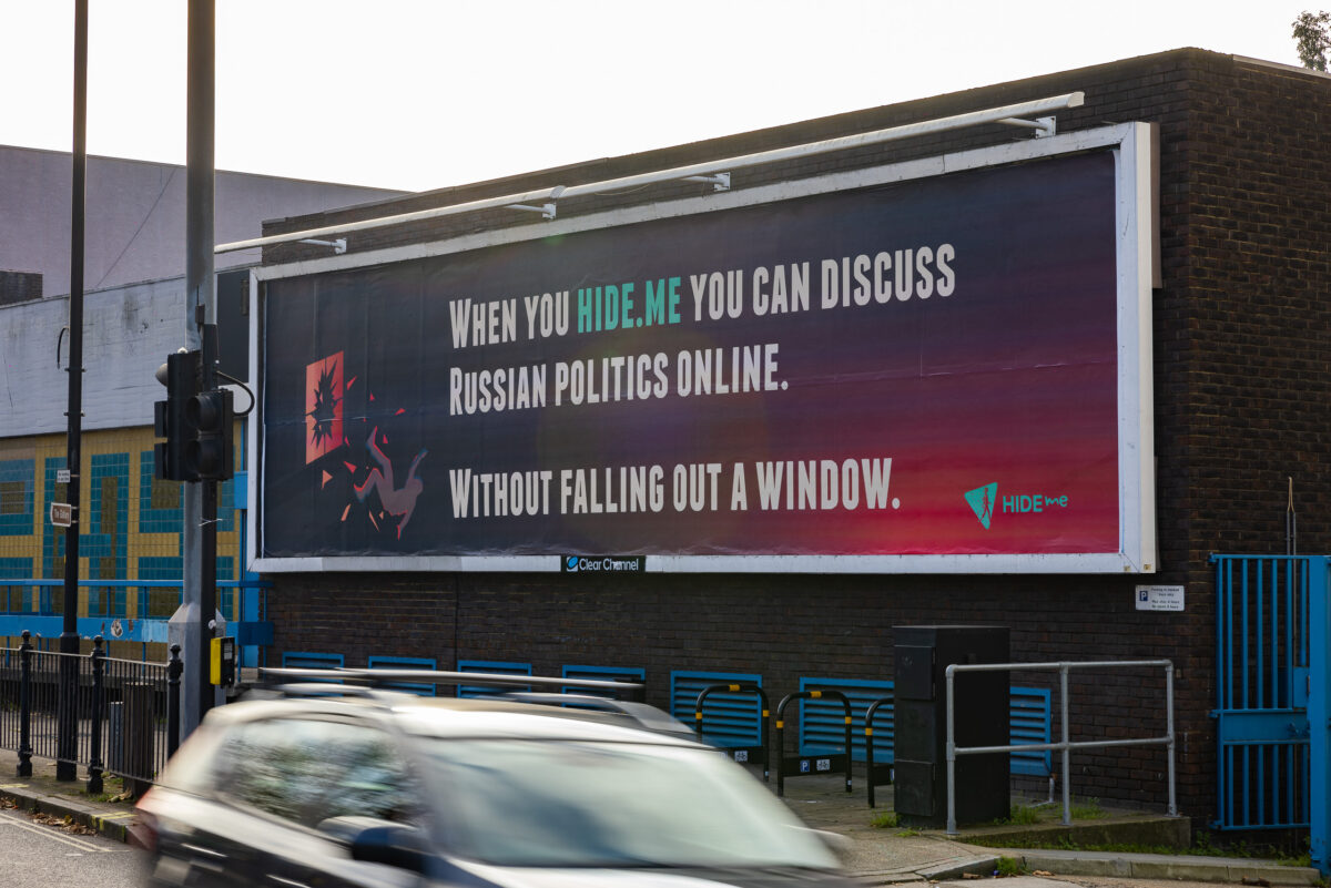 Referencing the Russian state’s notoriously robust management of any and all internal criticism, hide.me’s billboard explains to the wider public that by using a VPN, they will be able to “Discuss Russian politics online. Without falling out of a window.”