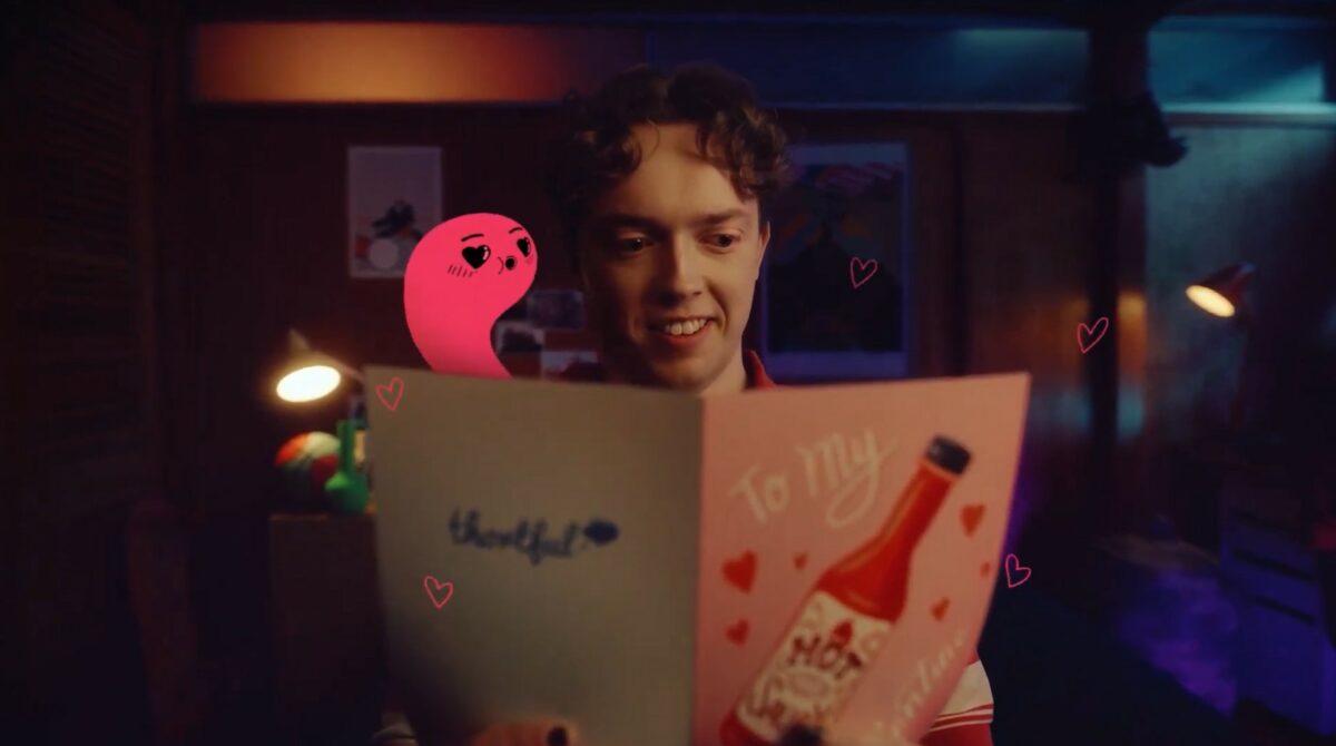 ‘The funniest bones’ campaign includes a 30-second spot that sees pink characters emerge from a greeting card. The creatures, who personify various emotions, worm their way around the man reading the card.