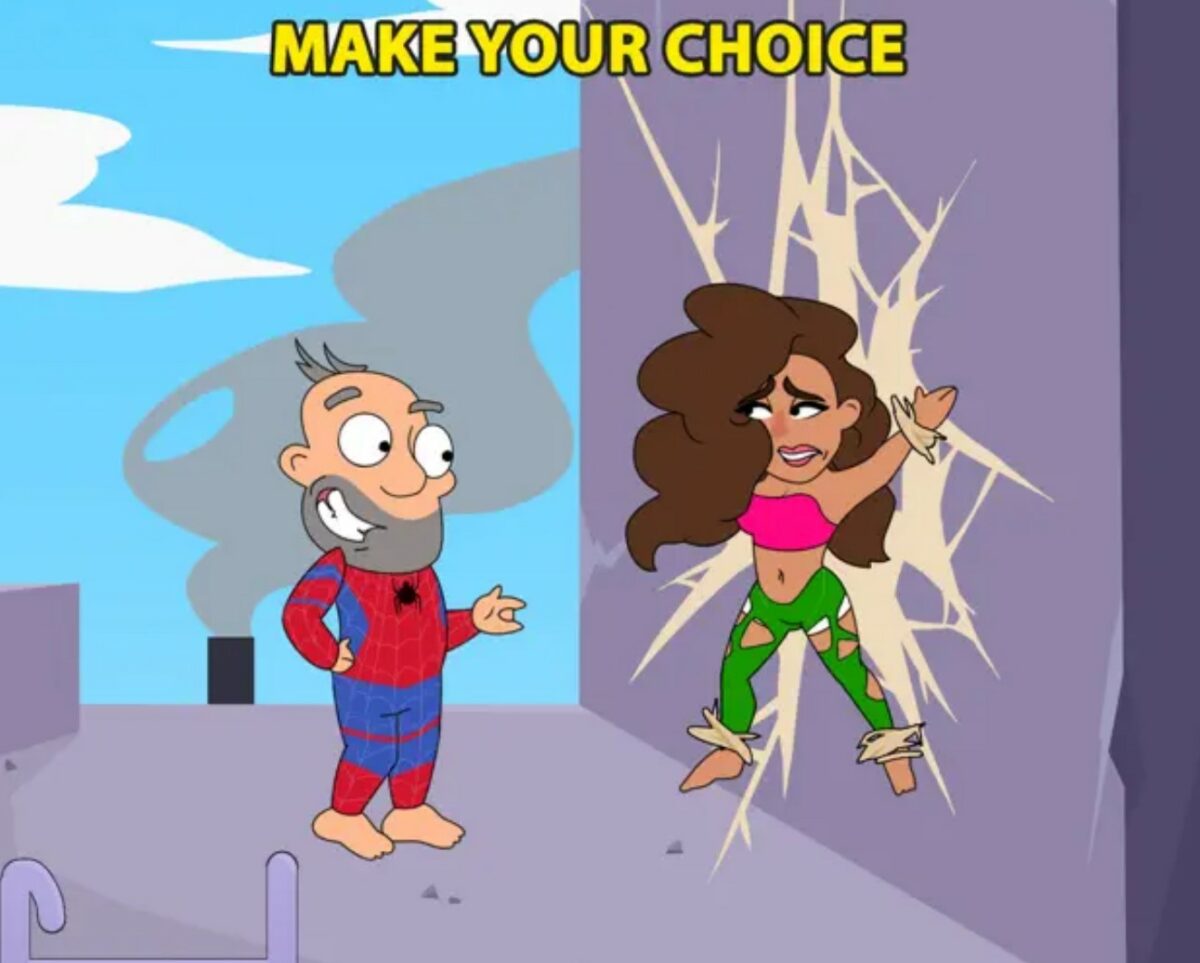 The ad depicted a male cartoon character – dressed in a Spiderman costume – saving a female cartoon character who was tethered to a wall in a starfish shape with her arms and legs splayed. A thought bubble with a red heart inside appeared above the male character’s head when he saw the woman. Two boxes then appeared which he could choose from, the first was of the girl’s face and the second was of her leggings. In each of the boxes, the spider web formed a phallic shape.