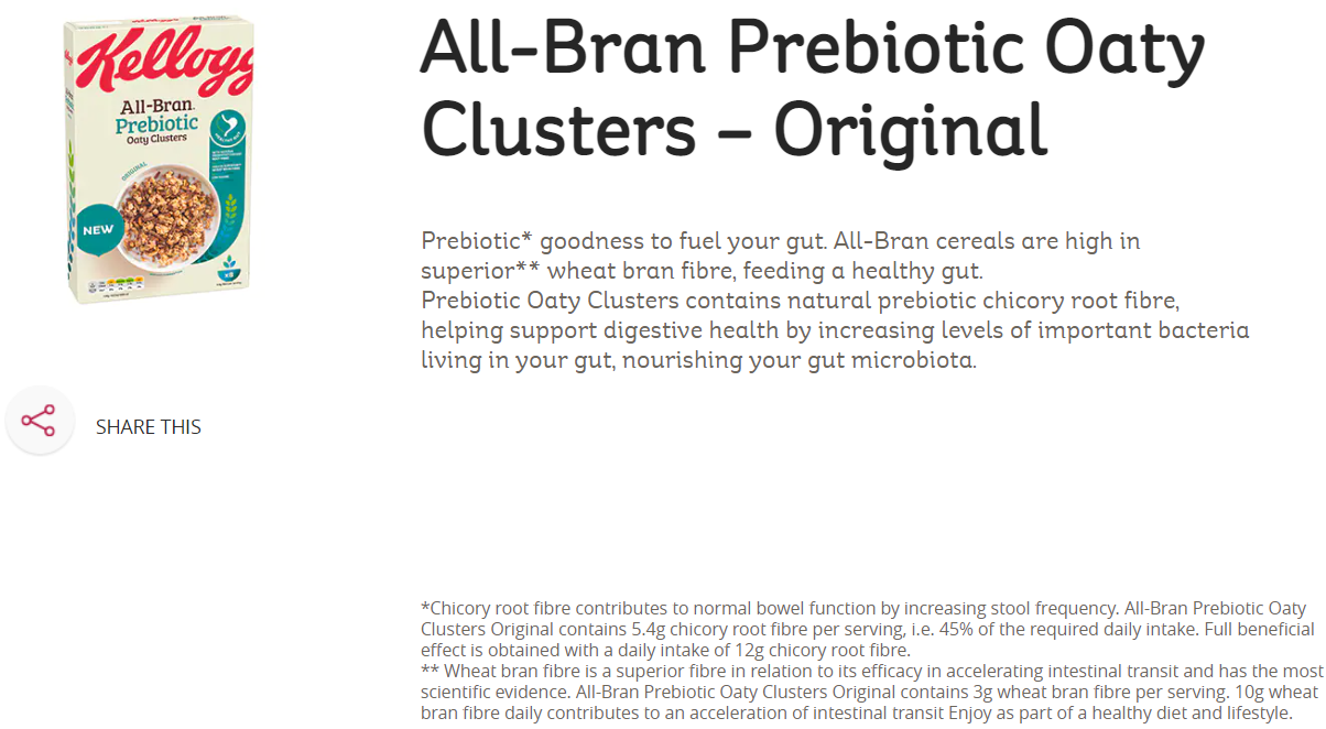 The banned website advertisement featured text that read “Prebiotic” and “Prebiotic goodness to fuel your gut”, along with other health claims such as “Chicory root fibre contributes to normal bowel function by increasing stool frequency” and “nourishing your gut microbiota”.