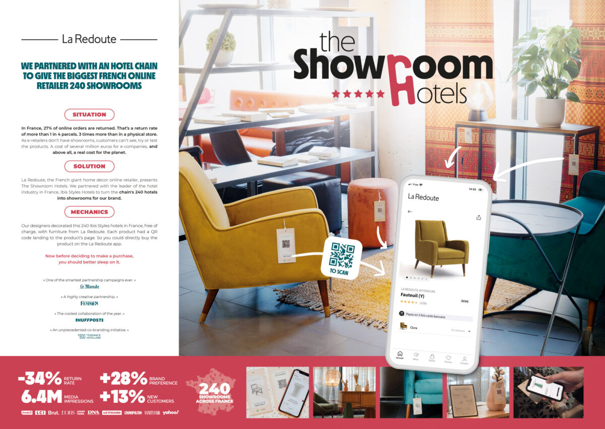 French home decor retailer La Redoute last year partnered with Ibis Styles hotels to provide all of the furniture across all 240 of its French establishments. Each item came equipped with a scannable QR code enabling customers to purchase the product directly via the retailer’s website. Registering 6.4 million impression, the campaign drove brand performance by 28% and increased customer acquisition by 13%.
