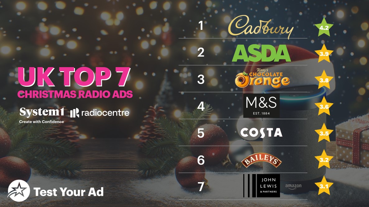 Each of the adverts were given a ranking from one to five stars, with Cadbury receiving 4.2 stars, while Asda, Terry’s Chocolate Orange, M&S, Costa, Baileys and John Lewis all appeared in the top seven.