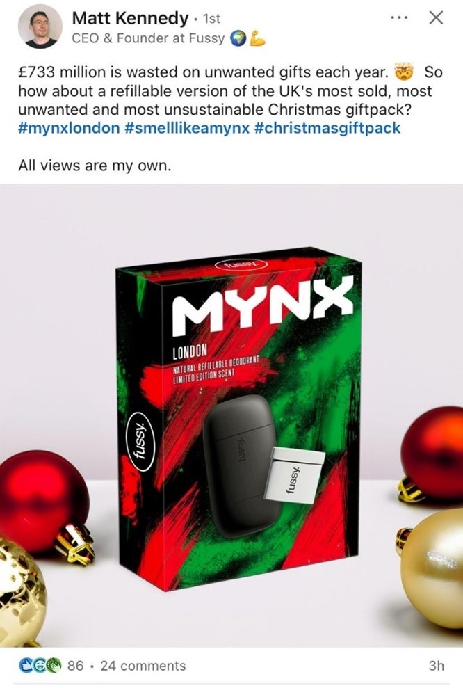 It read: “£733 million is wasted on unwanted gifts each year. So how about a refillable version of the UK’s [..] most unwanted […] Christmas giftpack?” along with similar hashtags.