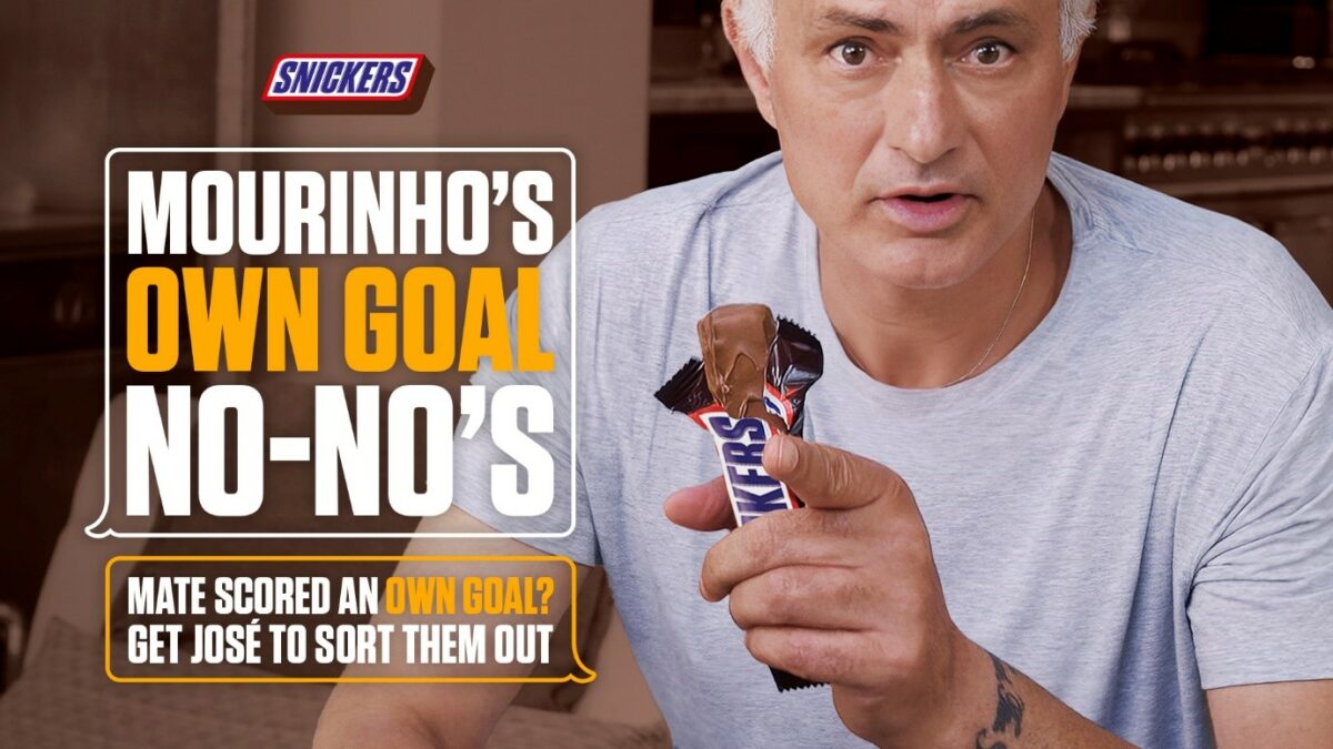 Snack bar brand Snickers has teamed-up with former Chelsea and Manchester United manager José Mourinho’s AI-generated clone to coach football out of their ‘own goals’ this summer.