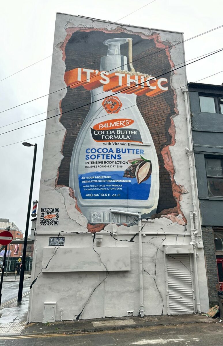 Palmers has created 9-metre tall 3D-looking murals of its popular Cocoa Butter Formula Body Lotion which shows the product breaking through brick walls.