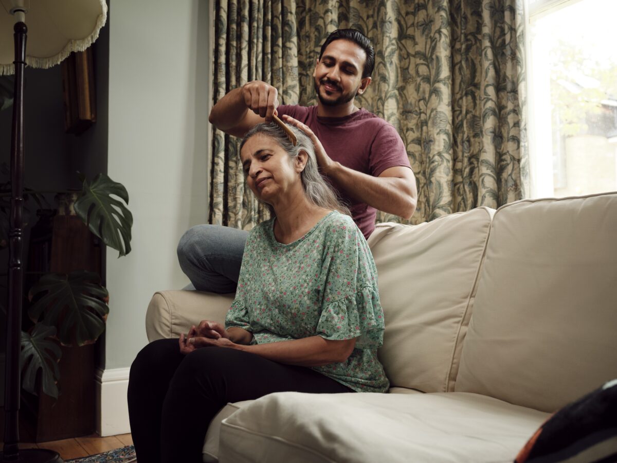 Striking photography carried out by Megan K Eagles for the out-of-home shows carers as they carry out tasks like brushing their parents hair and helping them bathe with the message that it counts as care too.
