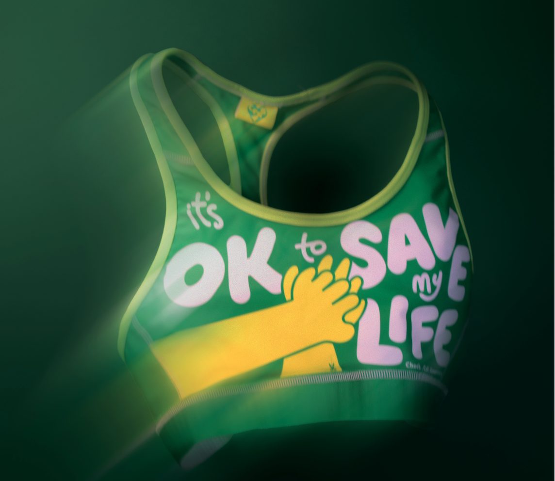 The bra features the message: ‘It’s ok to save my life’ on the front, alongside a reminder of the steps involved in carrying out CPR.