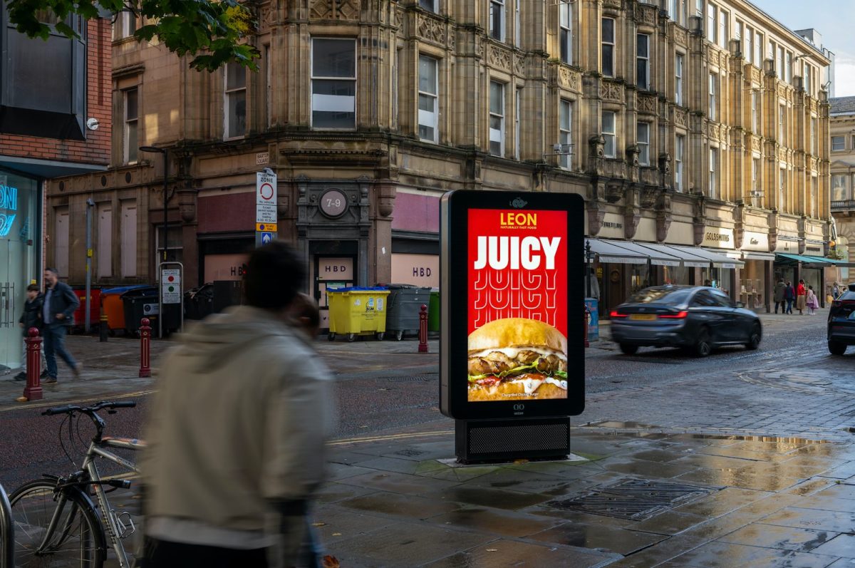 Eye-catching digital out-of-home placements will appear across 41 prime UK locations, including LEON’s first-ever campaign in Manchester – which will feature copy reading just one word, (such as ‘juicy’, or ‘crispy’) alongside a photograph from its new burger range.