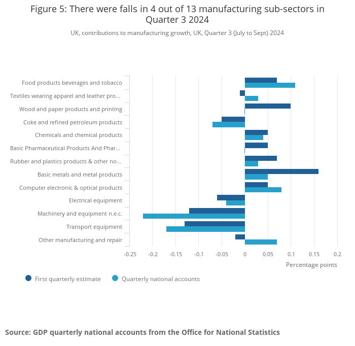 According to the ONS, the production sector was estimated to have fallen by 0.4% in quarter 3, revised from the first estimate of 0.2%. When compared with the same quarter last year, production output is estimated to have fallen by 2.3%.
