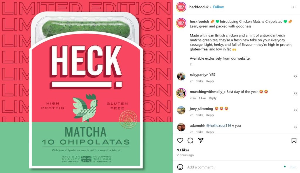 The next marketing stunt on our list is from Heck Foods UK. Known for their range of chicken sausages, the brand has launched a new matcha flavour this April Fool’s.