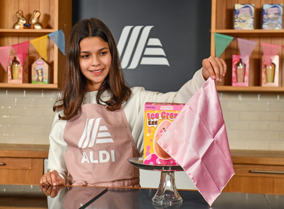 Aldi chose North London pre-teen Naomi Martínez’s ‘Dairyfine Ice Cream Egg’ design, which features an ice cream character topped with a strawberry drizzle, from hundreds of other entries from across the UK.