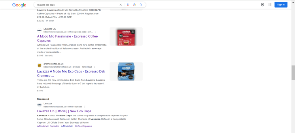 The first ad was a paid-for search ad for Italian coffee firm Lavazza’s Eco Caps coffee pods.